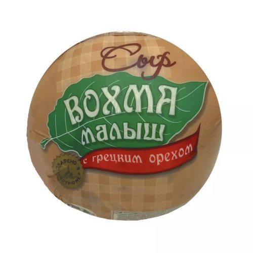 Это вариант классического полутвёрдого сыра «Вохма Малыш», дополненный кусочками грецкого ореха. Сохраняет мягкую, нежную структуру и сливочный вкус оригинала, но получает приятную ореховую нотку и лёгкую хрусткость. Консистенция — плотная, но пластичная, с вкраплениями дроблёного ореха. Во вкусе доминирует молочно-сливочная основа с лёгкой сладостью и пикантным оттенком грецкого ореха; аромат — орехово-сливочный с мягким молочным фоном. Жирность примерно 45–50% (в зависимости от доли орехов).