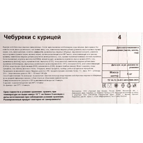 Состав: мука пшеничная хлебопекарная, вода питьевая, филе куриное без кожи без кости, масло растительное, лук свежий, кинза, соль, комплексная пищевая добавка (усилитель вкуса и аромата глутамат натрия, соль, мальтодекстрин, носитель гуммиарабик, ароматизаторы пищевые (“Курица”, “Дрожжевой экстракт”), усилители вкуса и аромата (гуанилат натрия, инозинат натрия), противораспыляющий агент МСТ-масло, антислёживающий агент диоксид кремния), комплексная пищевая добавка (загуститель метилцеллюлоза, соль, крахмал пшеничный нативный, клетчатка пшеничная, белок пшеничный, регулятор кислотности (E500ii)), яичный продукт, ароматизатор (усилитель вкуса и аромата (E621), соль, ароматизатор (желток)), перец чёрный молотый, эмульгатор (E322), чеснок молотый, комплексная пищевая добавка (мука пшеничная хлебопекарная, эмульгаторы растительного происхождения (E322, E471), консервант (E221), агент антислёживающий (E341iii), вещество для обработки муки (E920), антиокислитель (E300), фермент (грибная липаза)). Может содержать следы: сульфитов, сои, глютена, молочного белка, сельдерея, яичных продуктов, горчицы, рыбы и продуктов их переработки. Произведено из мороженого сырья.