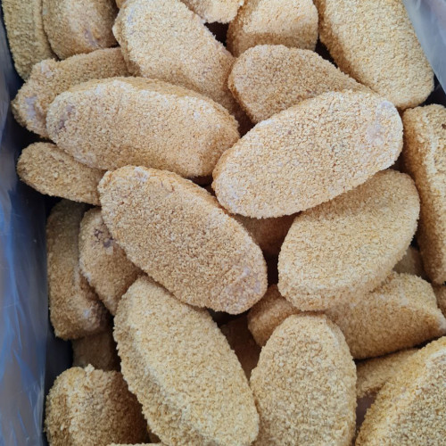 Состав: филе минтая мороженное, вода питьевая, сухари панировочные (мука пшеничная хлебопекарная высшего сорта, соль, пищевой краситель (аннато), вода питьевая), комплексная пищевая добавка (мука пшеничная хлебопекарная высшего сорта, соль, крахмал картофельный, разрыхлители (E450i, E500ii), краситель (E160c)), масло растительное, комплексная пищевая добавка (загуститель (метилцеллюлоза), пищевые волокна пшеничные, крахмал картофельный, соль, регулятор кислотности (E500i)). Произведено из мороженого сырья. Возможно попадание мелких косточек! Может содержать следы: сульфитов, сои, глютена, молочного белка, сельдерея, яичных продуктов, горчицы и продуктов их переработки.