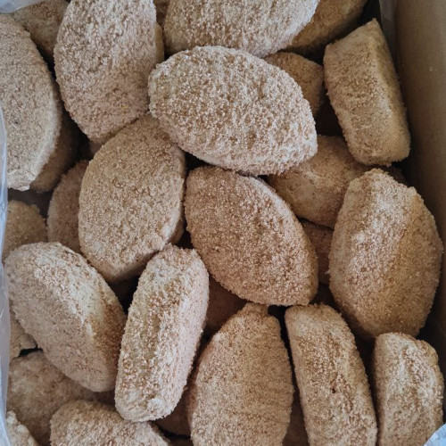 В составе котлет Фарш рыбный (судака), вода, сухари панировочные (мука пшеничная, соль, дрожжи хлебопекарные; натуральные красители – куркума, аннато), клетчатка растительная, мука пшеничная, масло растительное, лук, загуститель – метилцеллюлоза, пищевые волокна пшеничные, крахмал картофельный, соль, регулятор кислотности – карбонаты натрия, продукт яичный, комплексная пищевая добавка (перец черный, кориандр, кардамон; декстроза, усилитель вкуса и аромата – глутамат натрия, регулятор кислотности Е451, ароматизатор). Котлеты произведены из мороженого сырья, могут содержать следы сои, молочного белка, сельдерея.