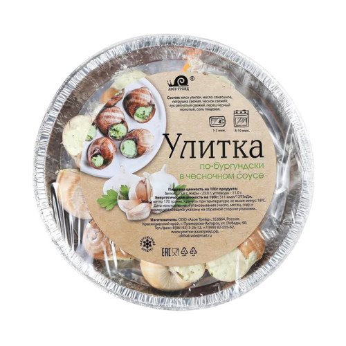 Состав: мясо улиток (helix aspersa) 50%, масло сливочное, чеснок свежий, петрушка свежая, перец, соль