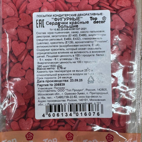 Состав: Сахар, мука рисовая, масло пальмовое, носитель (Е1422), декстроза, загустители (Е415, Е466), эмульгатор (лецитин соевый), глазирователь (шеллак), краситель, ароматизатор "Ванилин".